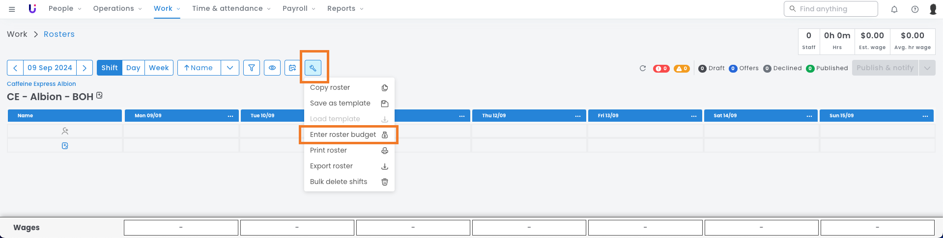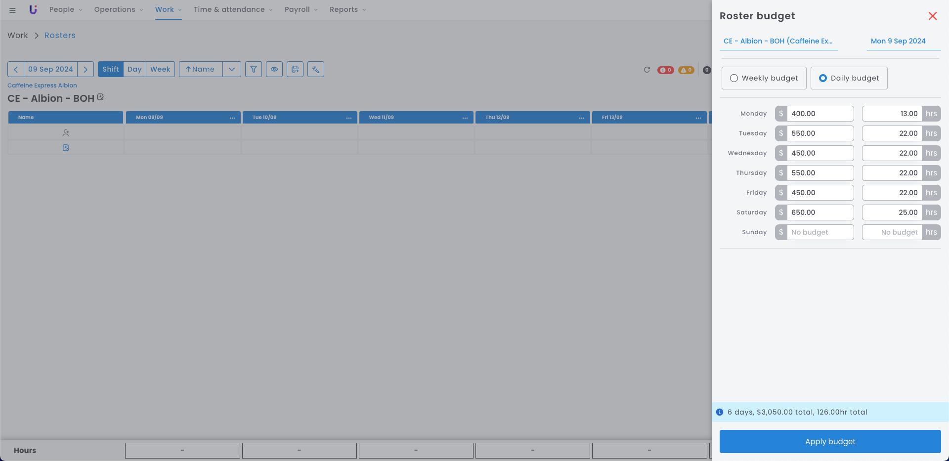 Setting a budget for your employee labour can help you manage your wage costs effectively. You have the flexibility to set individual budgets for each roster, this can be done for an entire week or per day.