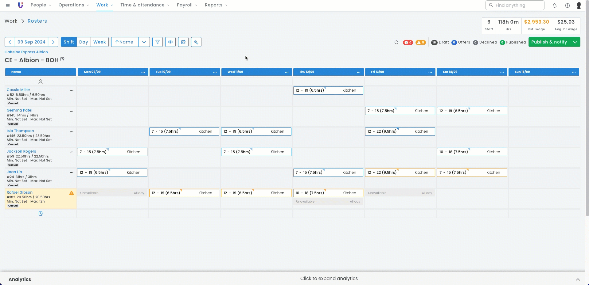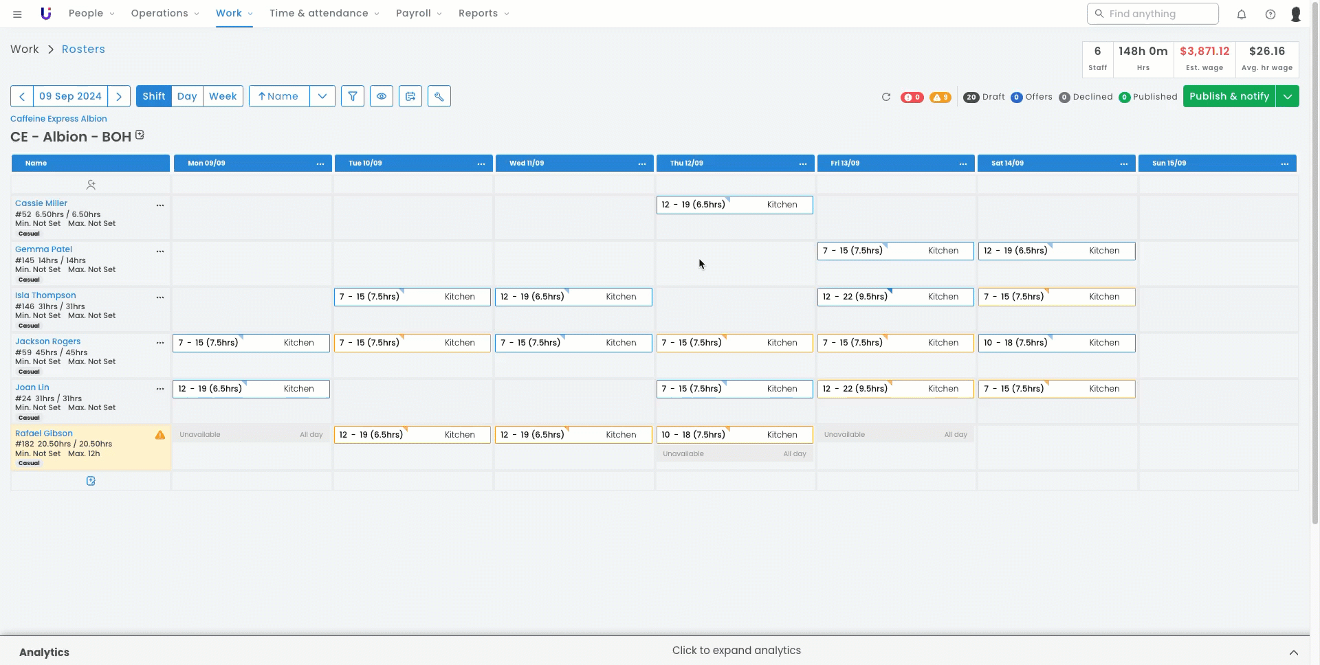 Hot tip: When you have multiple rosters filtered on your screen, the Est. Wages analytic will combine all wages and budgets. Hover over this to see how many rosters have budgets added, as this may appear to be over budget when you include rosters that do not have a budget.