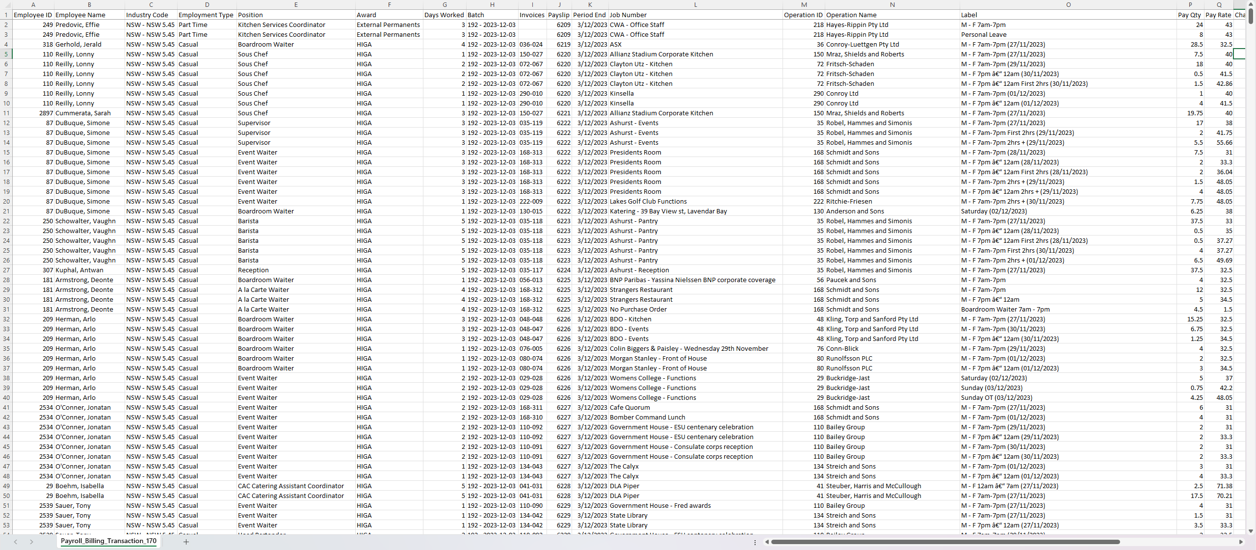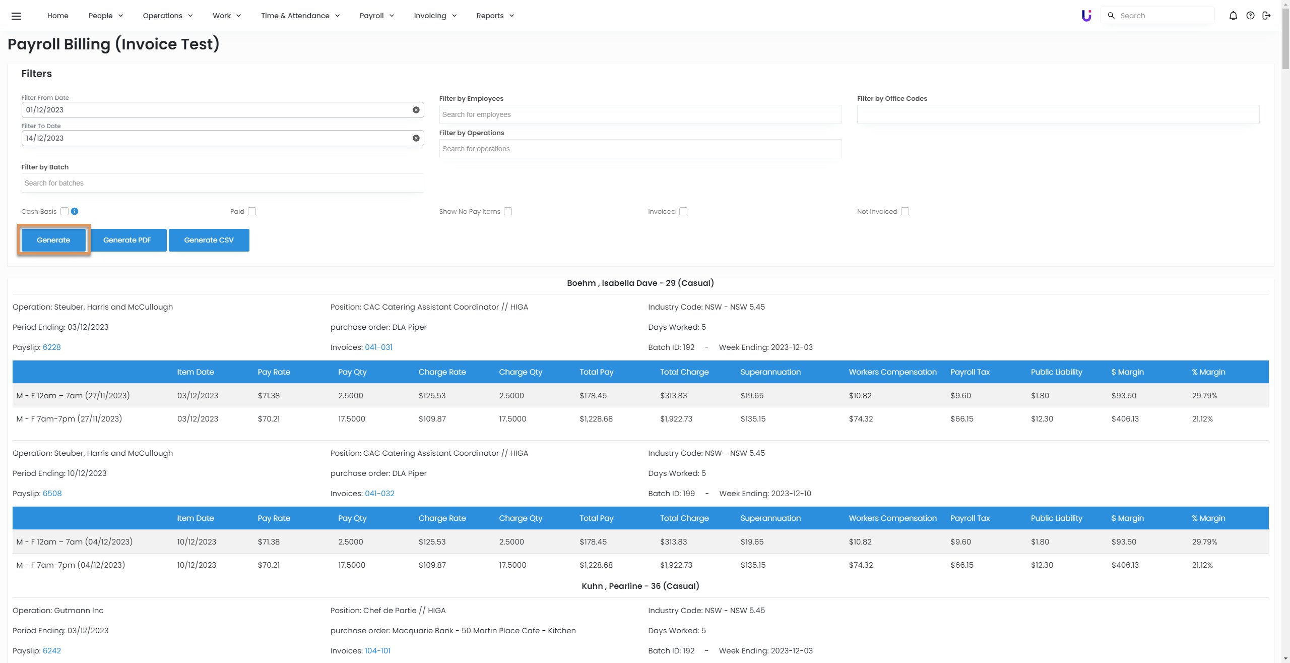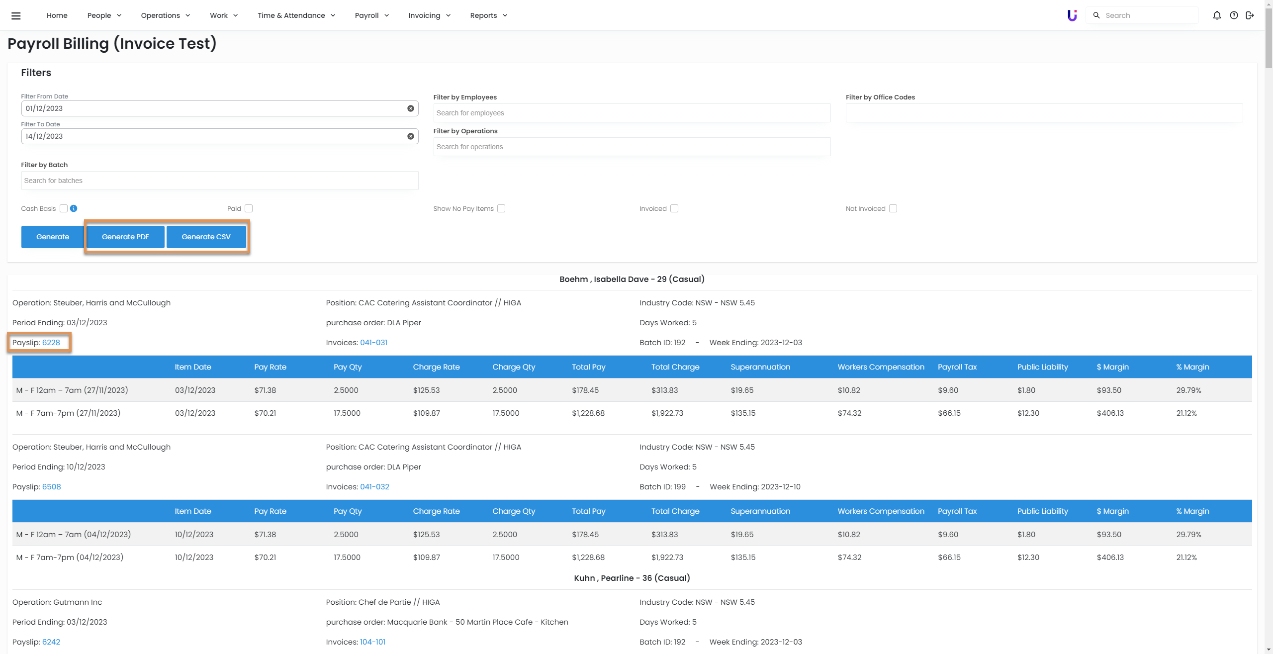 Before processing payslips, you can access the Payroll Billing report to review full payment breakdowns and details such as charge-out rates. This report is also useful for previewing pending invoice data and can assist with budgeting.