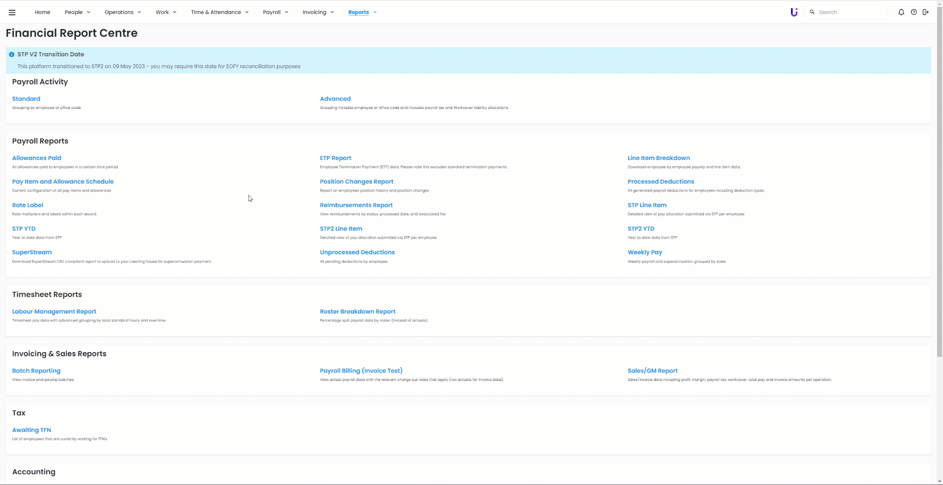 - Navigate to Reports > Financial Reports and select the Payroll Billing (Invoice Test) report.