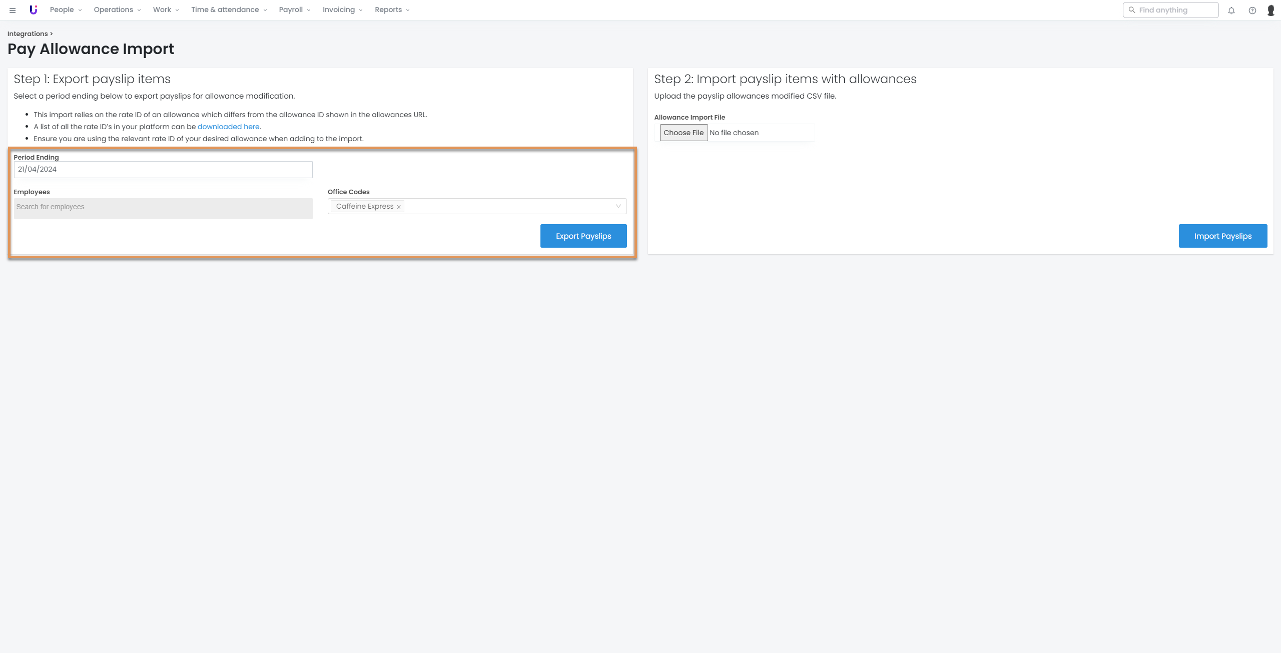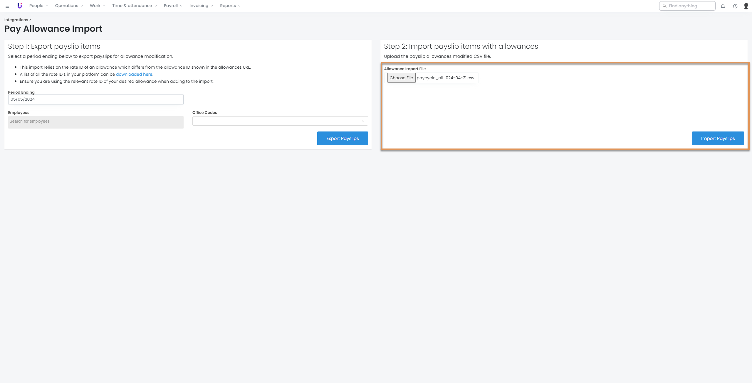 The import allowances CSV export lets you export your unprocessed payslips from the Pay page and import allowances in bulk to apply them before the pay cycle is processed.