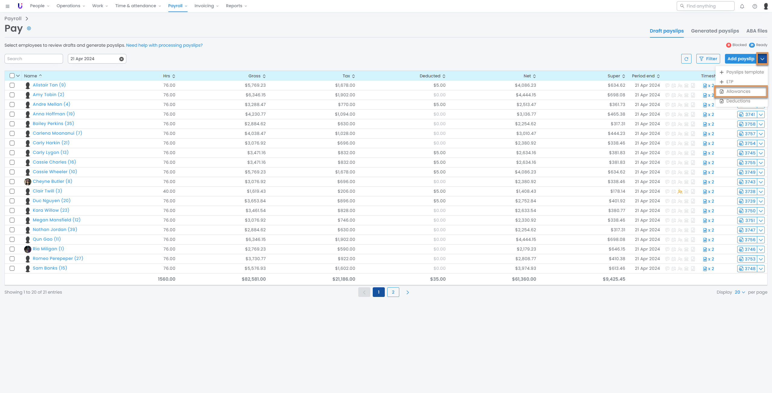 - Navigate to Payroll > Pay and next to the 'Add payslip' option, select the down arrow > Allowances. This will take you to the Pay Allowance Import page.