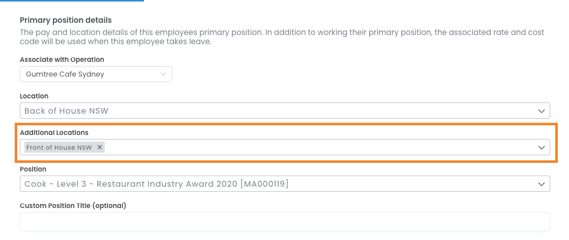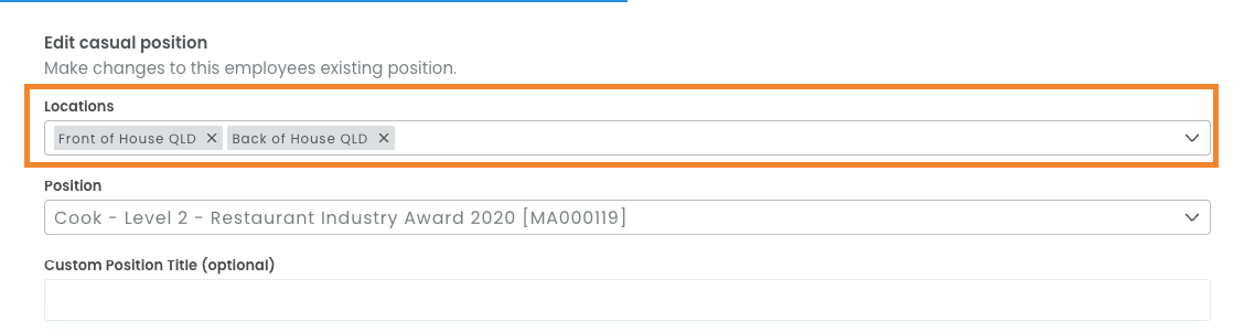 Causal & Additional Positions - To add multiple locations for your casuals or any additional positions for your permanent employees, simply edit the existing position and select each additional location in the Location field.