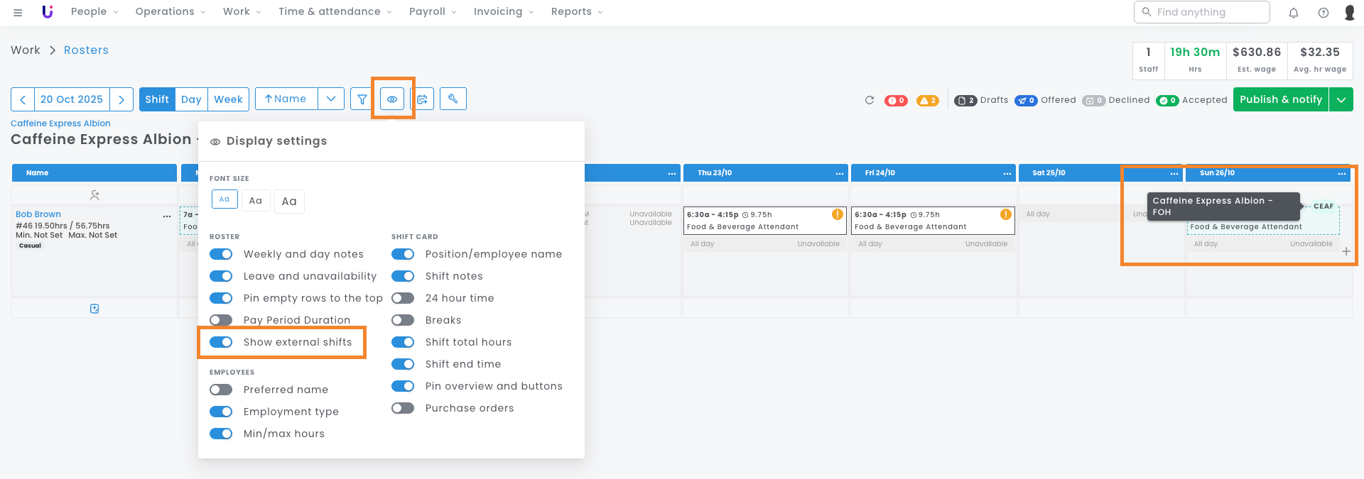 Viewing Shifts - In your Display Settings, enable the 'Show external shifts' option. This will allow you to see if an employee is already rostered elsewhere, even for rosters managed by other admin users.