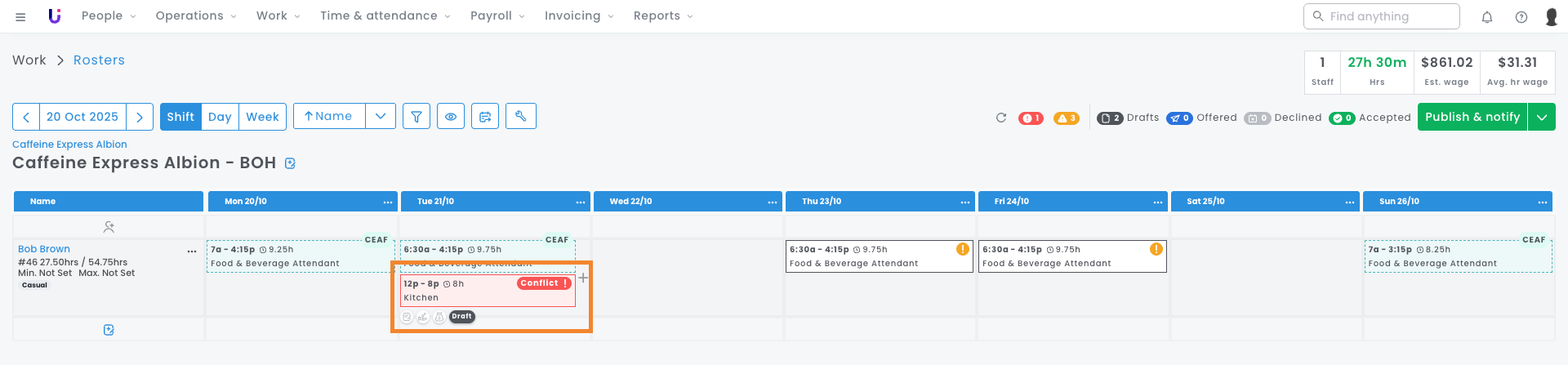 Shift Errors - If you try to roster an employee who is already assigned to work another shift, you will see a Conflict error. This will need to be resolved by either editing the shift times or reassigning the shift to another employee.