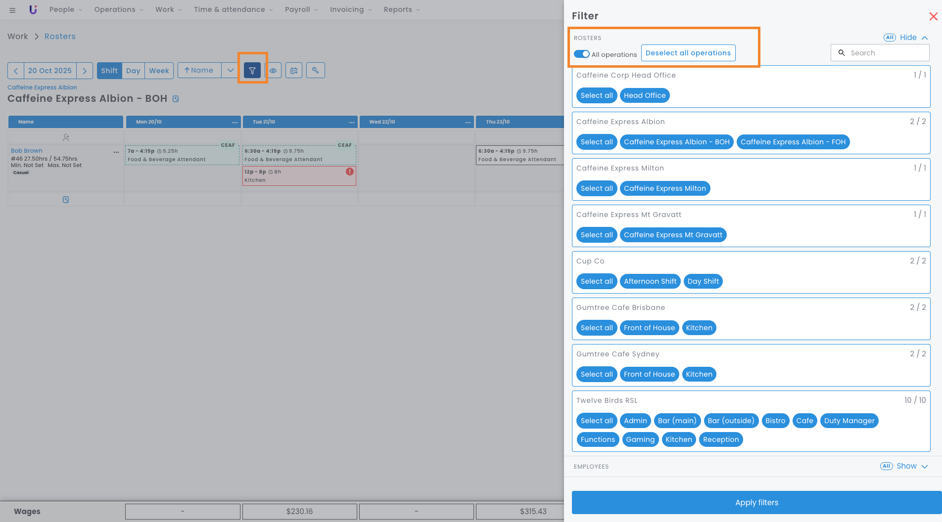 Filter your Rosters - If you have access to multiple rosters, even across multiple Operations, you can use the Filter option to view multiple roster locations at once. This is useful if you use multiple Rosters simultaneously.