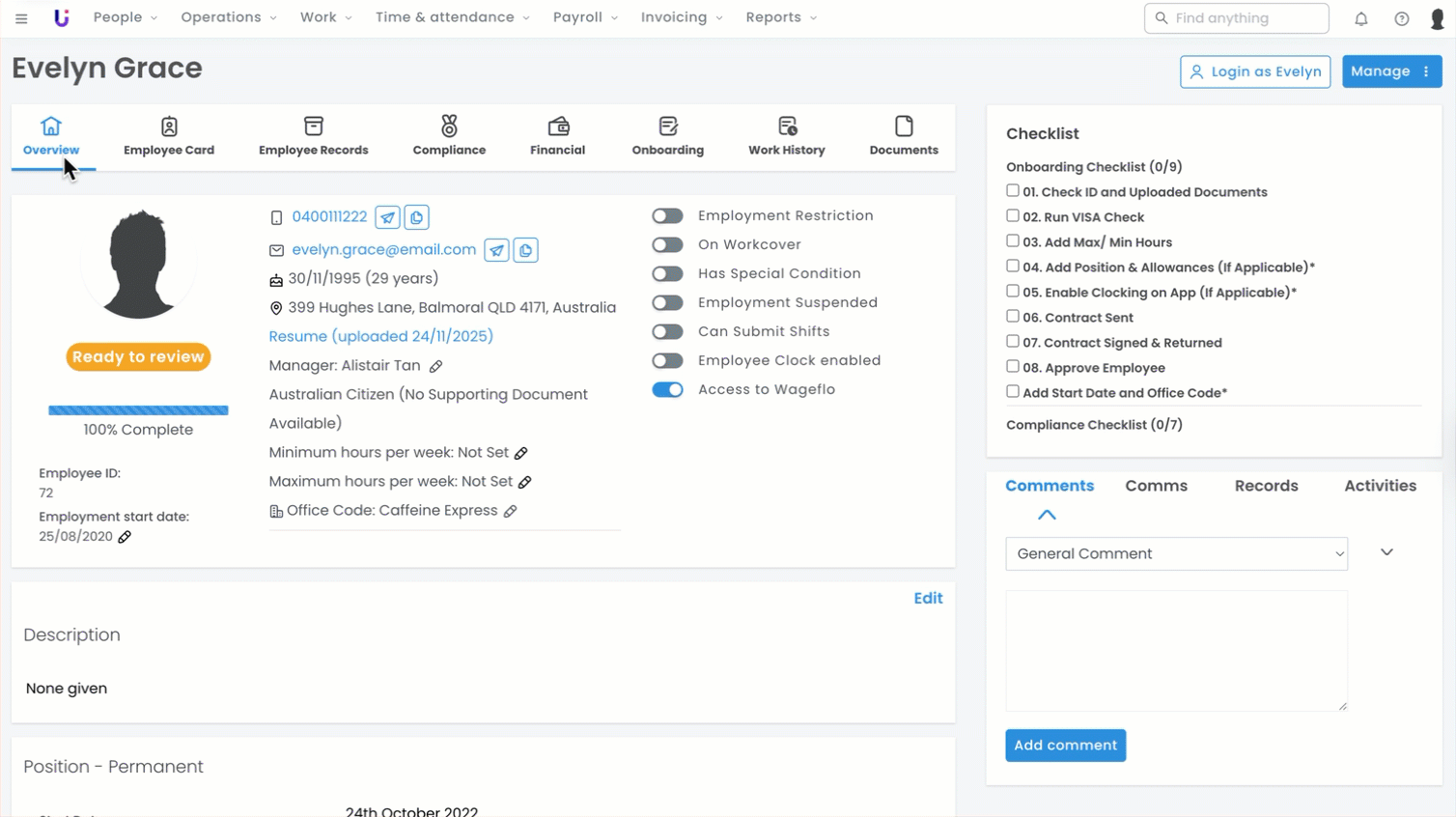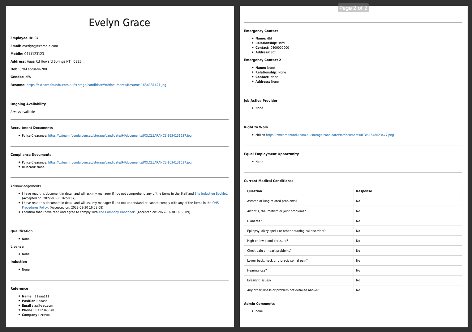 An employee profile summary relating to screening & onboarding information is available to download as a PDF. This action can be performed on any person on your platform and may be useful for both Pending People candidates and Approved People (employees).