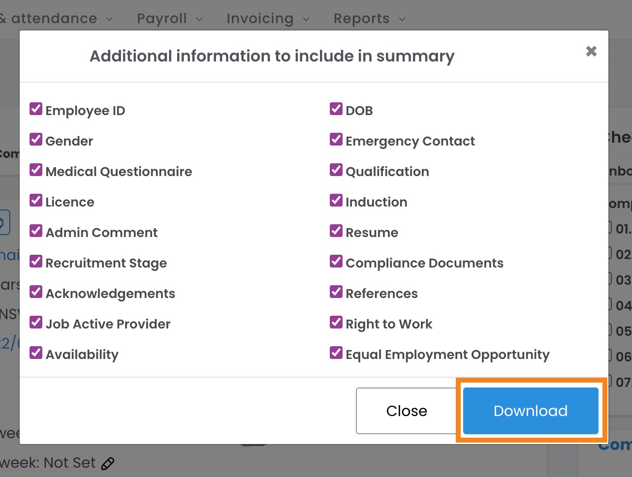- You can export the below details about an employee or candidate, you can customise the export using the tick boxes.