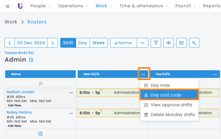 - Assign a Cost Code to a single day and a single roster -This method is accessed via the ellipsis above the date on a single roster.