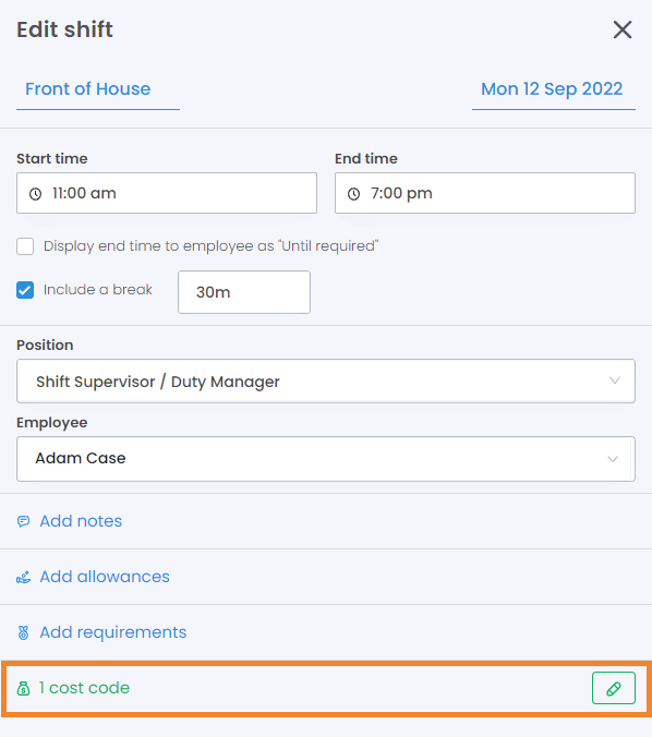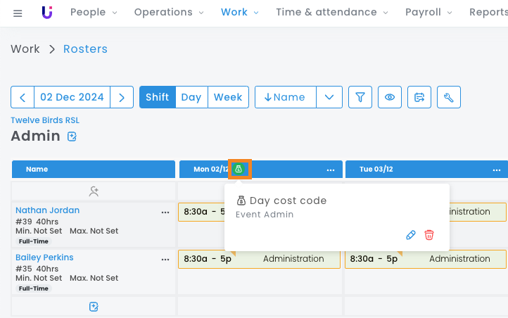 Cost Codes can be applied on a per-shift basis, which will append to or override the Cost Code set on the day and roster.