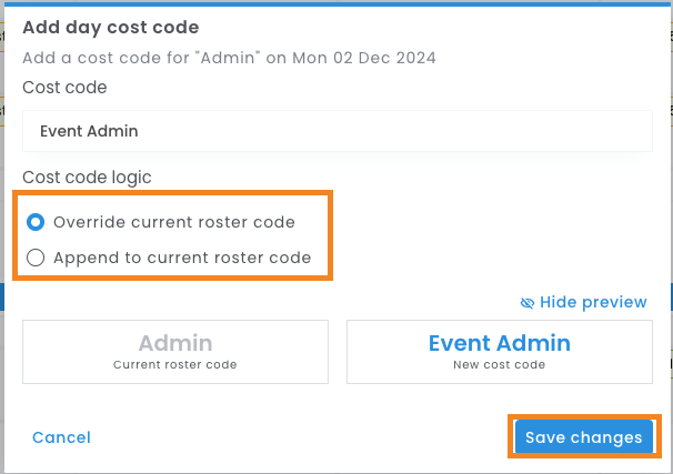 - Select whether the Day Cost Code should override or append to the roster Cost Code.
