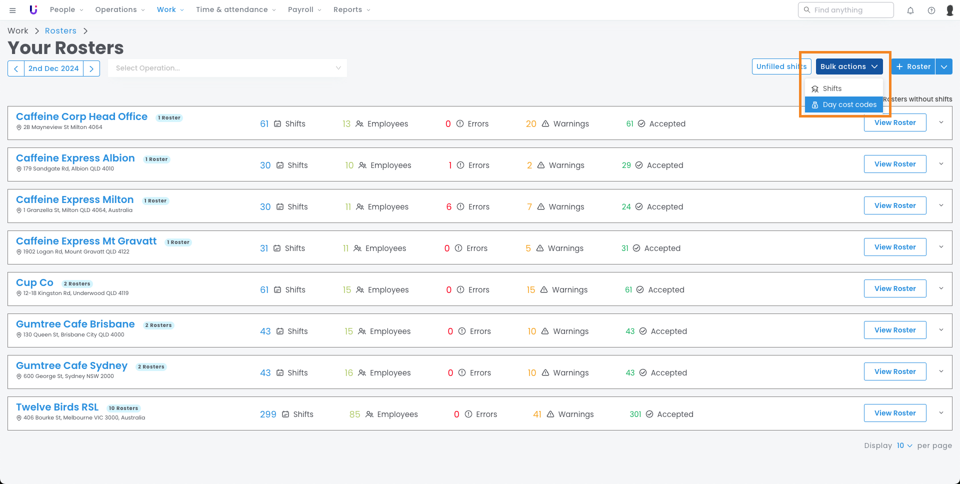 - Navigate to Work > Rosters > and locate the Bulk Actions button.