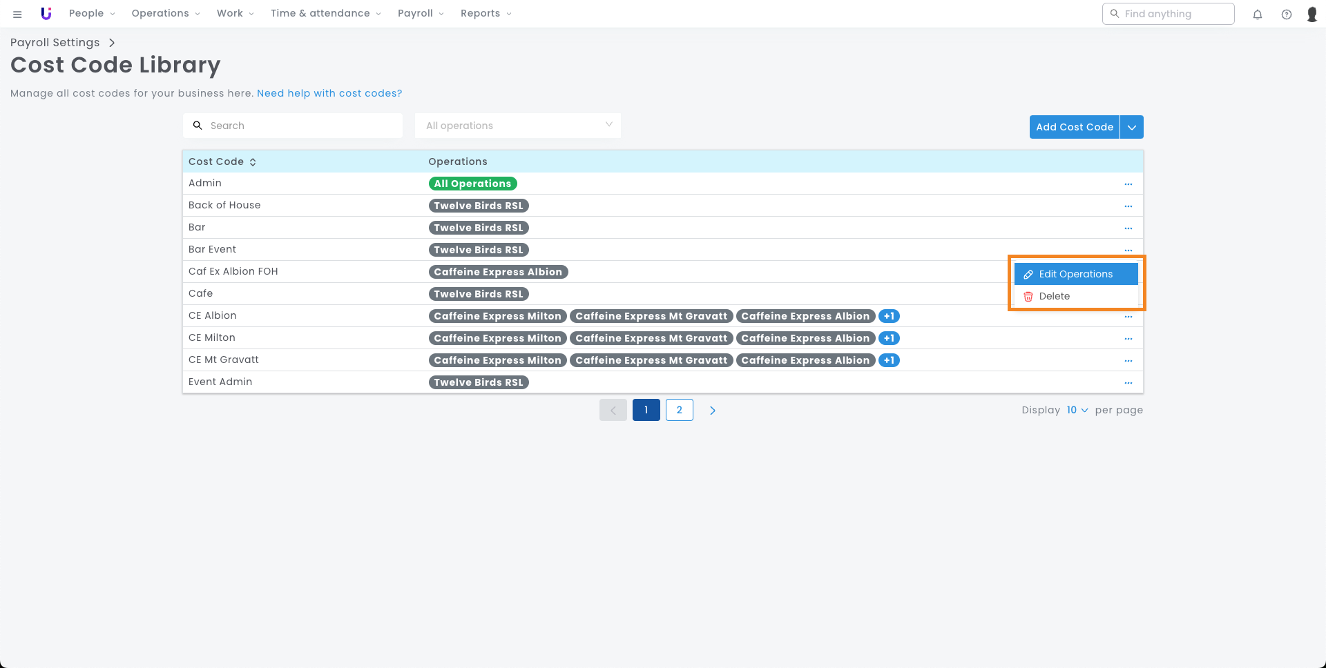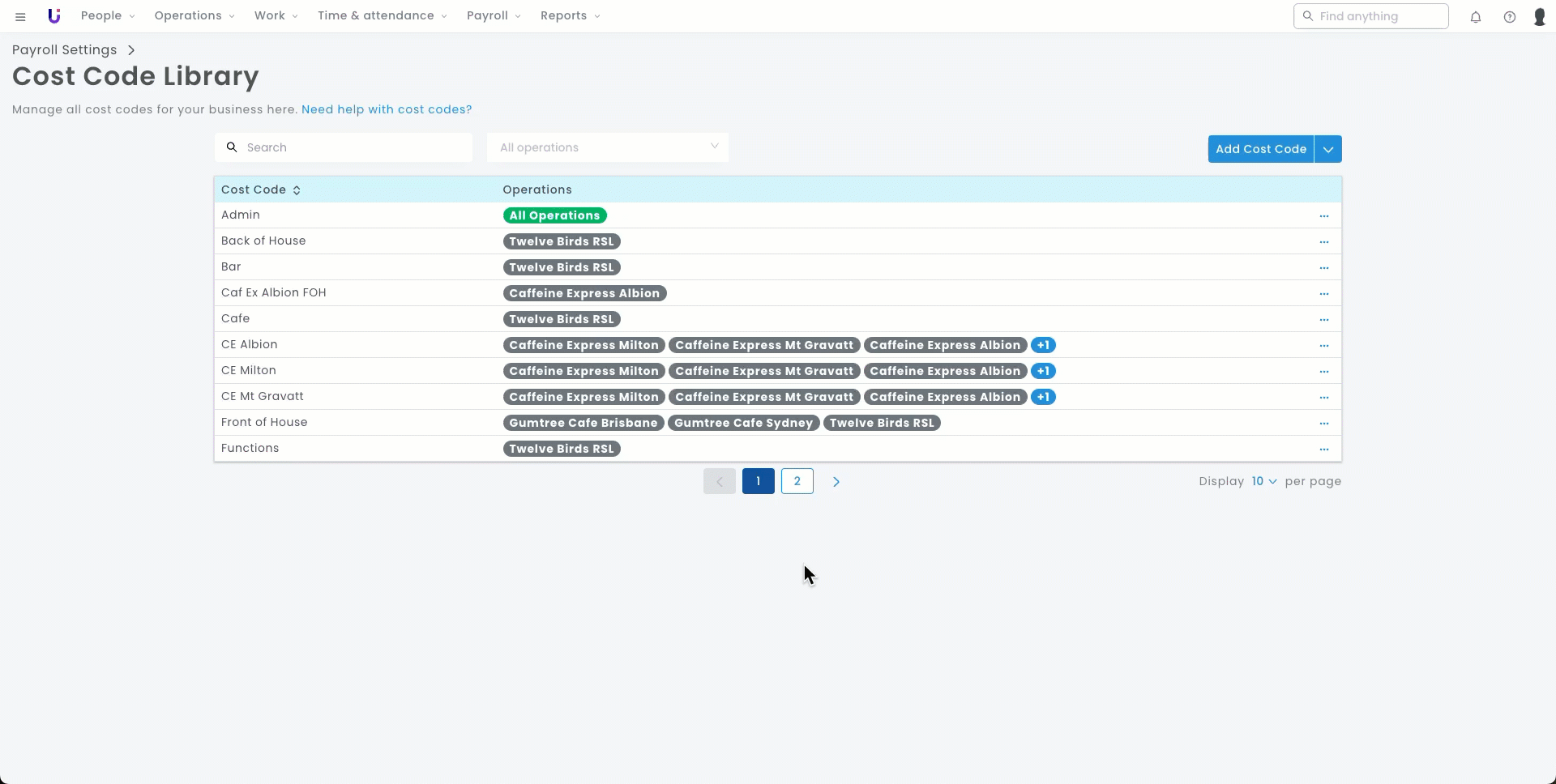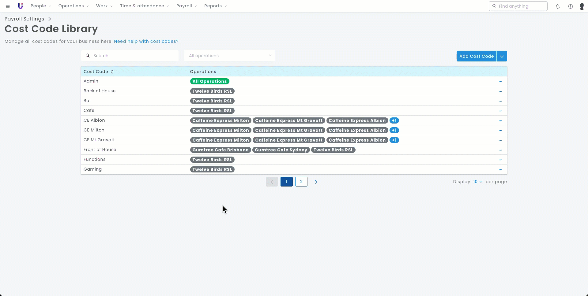 - Navigate to the main menu > Payroll Settings > Cost Code Library.