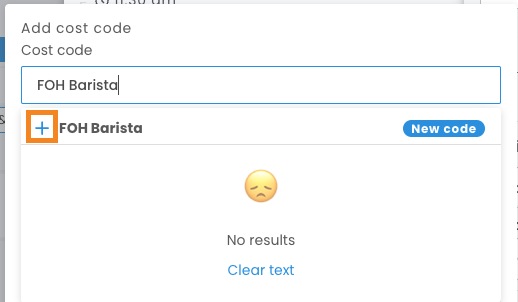 When assigning a Cost Code anywhere in the platform, whether that be on the roster, on a shift, or on an employee's position. If the Cost Code you are searching for does not exist, you will have the option to create a new one by selecting the + icon next to the Code name you have typed in.