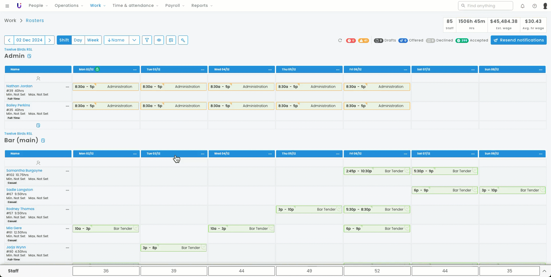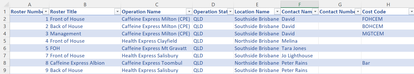 - Cost Codes have been added to each roster based on the group (i.e. both bar rosters have 'Bar' as their Cost Code).