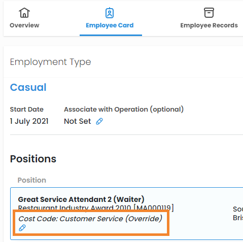A Cost Code can be applied to a position on an employee's profile. Position Cost Codes are above both shift & roster in the hierarchy, so they will take preference over everything.