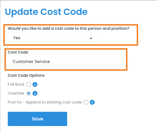 Append - Adds the Cost Code to any existing ones (e.g. roster - position).