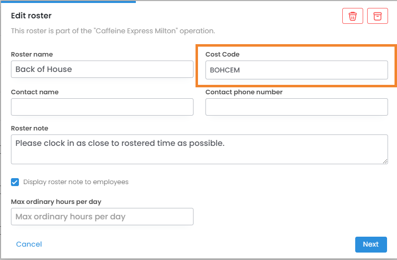 Please note: Salaried employees should have a Cost Code assigned to their position, as rostering them will not affect the Cost Code that is used.