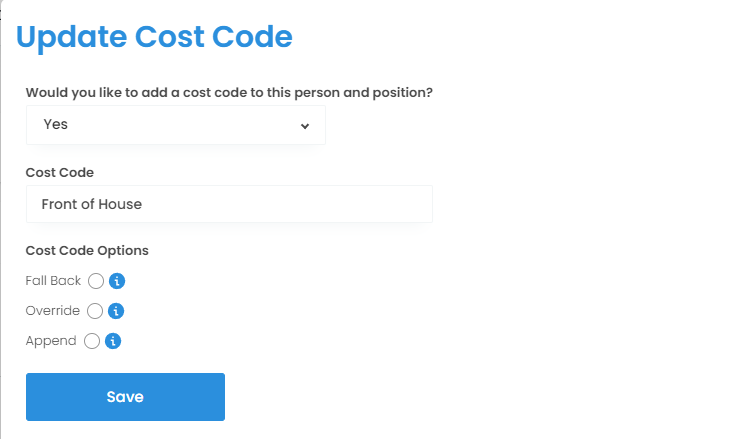 Please note: In the case of a salaried employee, all options (fallback, append, override) will behave the same, and the Cost Code assigned to the position will be used regardless.