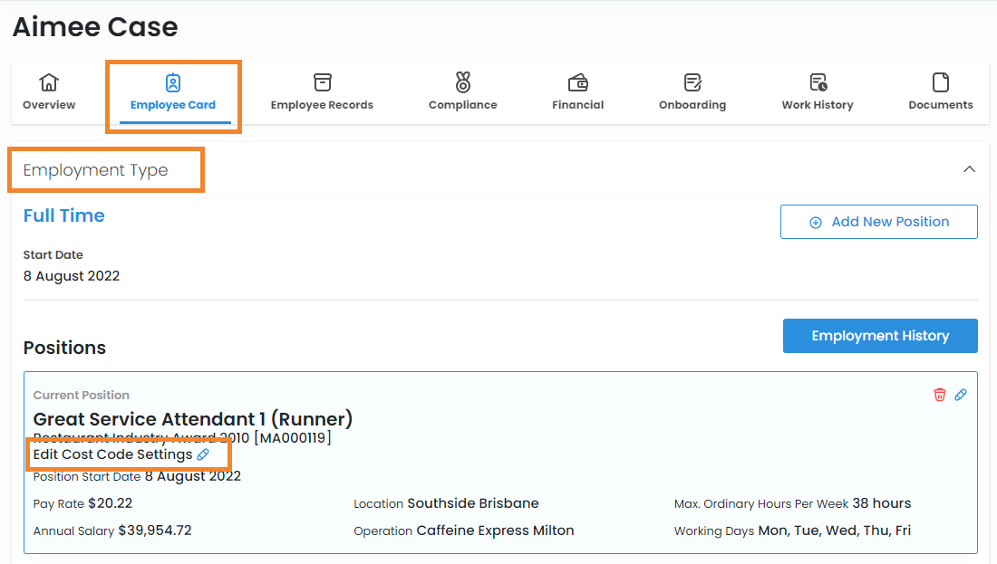 - Jack has several positions on his profile, allowing him to work and be paid for different roles. Some of these positions are costed separately. Adjust the position code settings to see how this interacts with the roster, day, and shift Cost Codes.