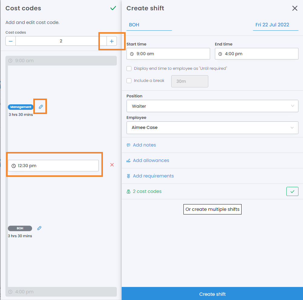 Multiple Cost Codes can be added to a single shift, either on the roster or in Approve Shifts. This is a very powerful tool as it will allow you to split different portions of an employee's shift across different Cost Codes.