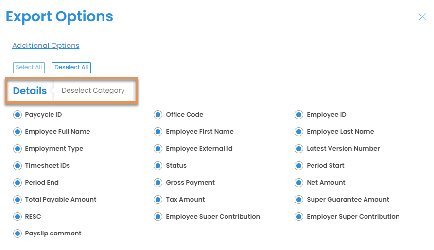 - Then select the relevant fields to export; the categories available are: