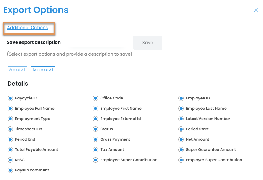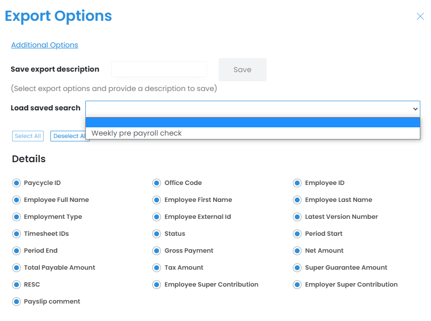 Once you have selected the combination of export options you would like to use, saving them for future use is a good idea. This way, you can quickly export your pay data at any time without having to reselect your desired options each time you export.