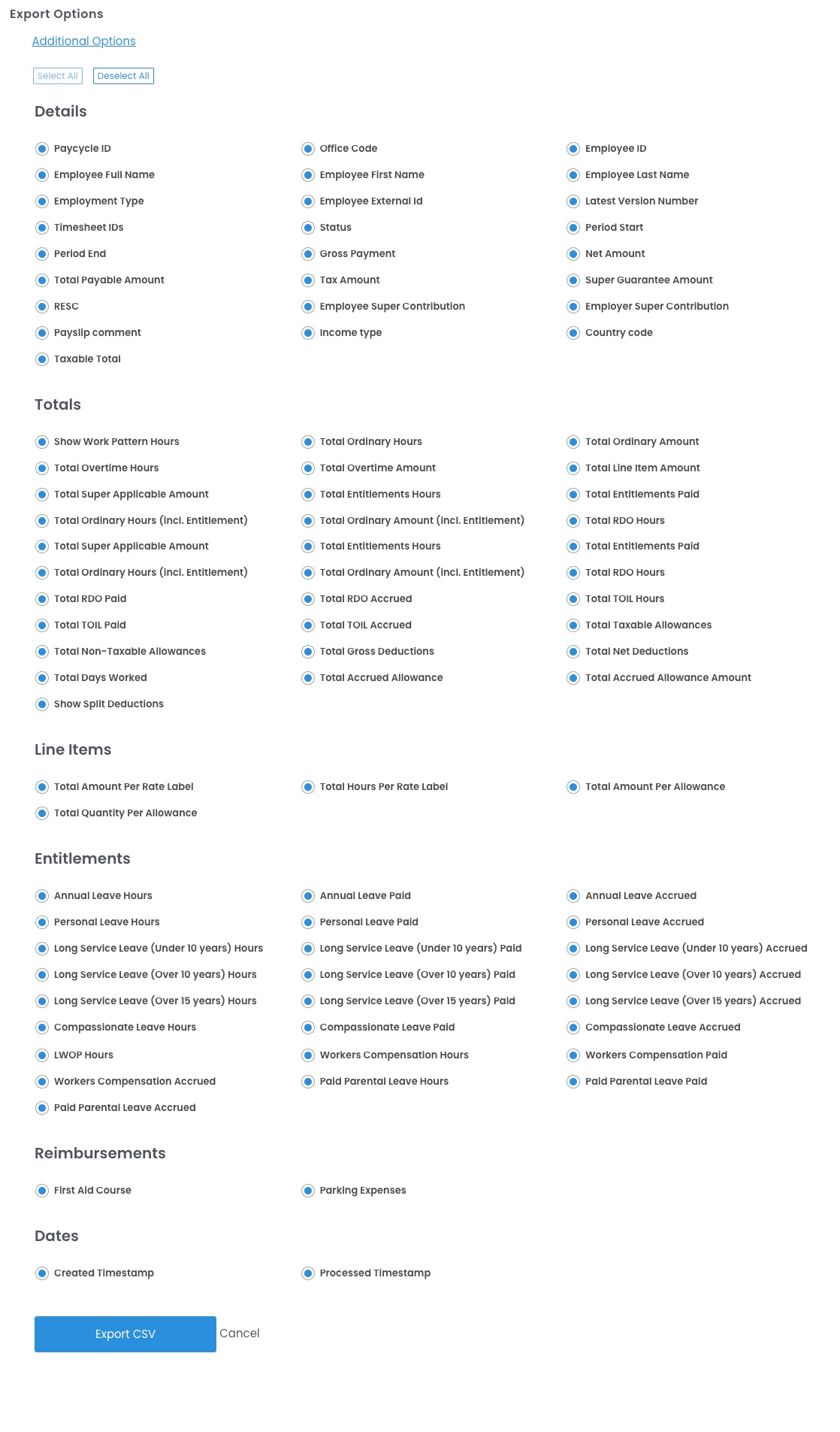 - Generated payslips - For exporting payslips paid to employees.
