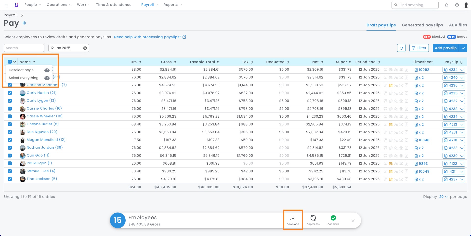 Hot tip: If you have any Blocked draft payslips, you can still select and export their pay data to review.
