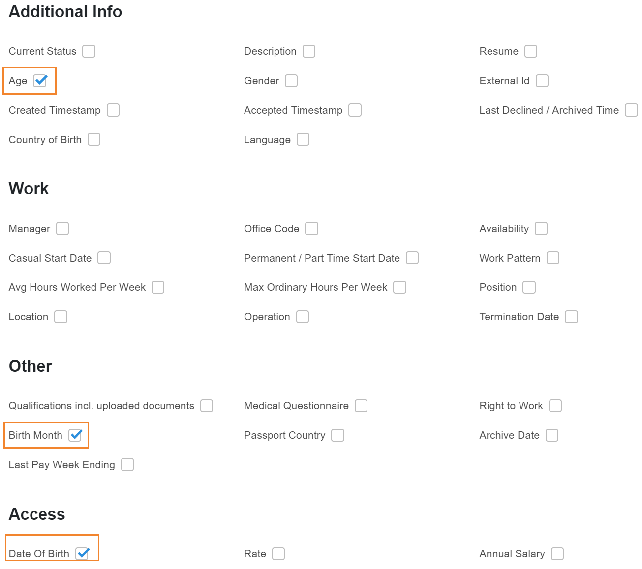 - Select the data you wish to export making sure to tick 'Date of Birth' (under 'Access' heading and/or 'Birth Month' (under the 'Other' heading) and/or 'Age' (under the 'Additional Info' heading) and 'Position' or 'Additional Position' (under the Work heading).