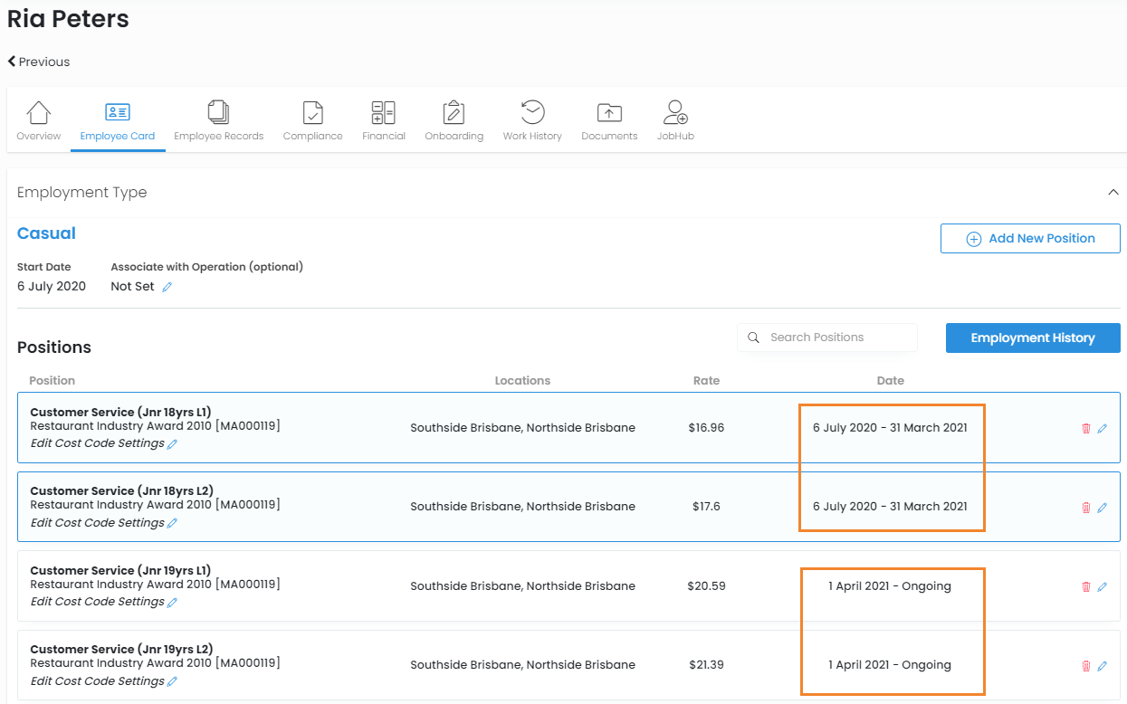 When managing your casual junior employees, best practice is to use the start and end date to indicate when your employee will be paid their next level rate e.g. on their birthday the next year.
