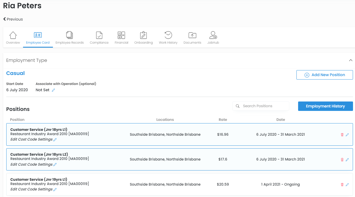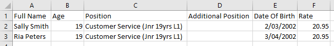 Below is an example for Ria who is currently 18 years old who works both as a level 1 and sometimes as a level 2. As her birthday is on the 1st of April, we have set up her 19 year old rates already. This means that the correct rates will flow through once she turns 19.