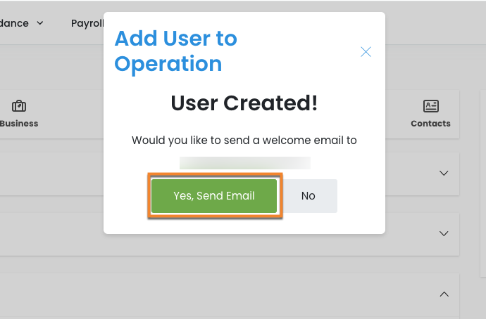 - You will be asked if you wish to send a welcome email (this will send an email with their login URL and ask them to create a password). Select Yes, Send Email to send, or if you do not wish to send select No.
