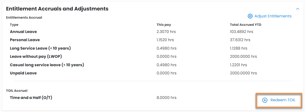 Please note: you won't see a Redeem TOIL option unless the employee has accrued TOIL. -