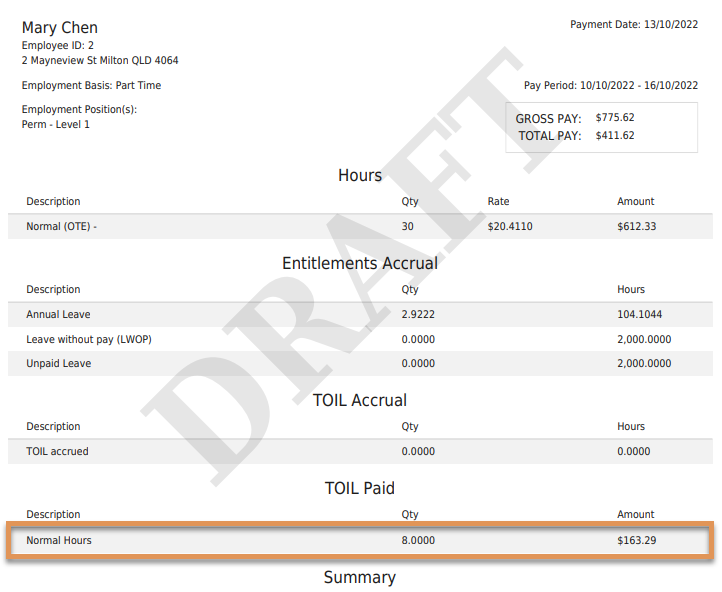 Once you have made the relevant changes select Update Payslip. The redeemed TOIL hours will display on the payslip as per below: