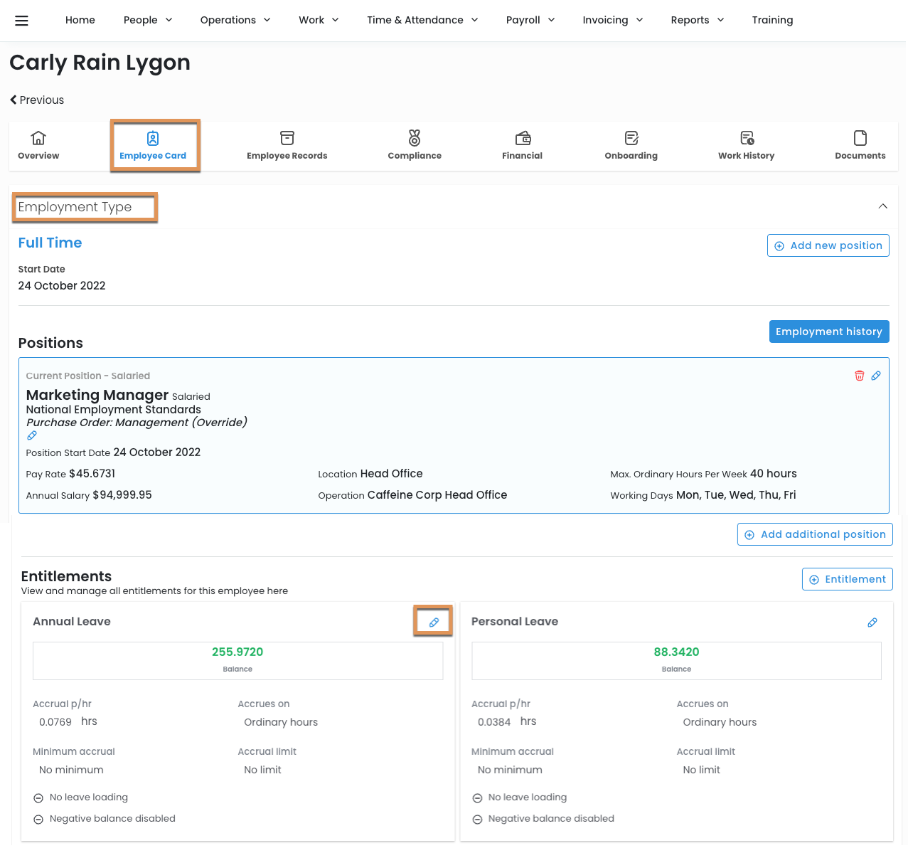 Once in the Employee Profile navigate to Employee Card > Employment Type to see the leave entitlements and select Edit against the entitlement you would like to modify.