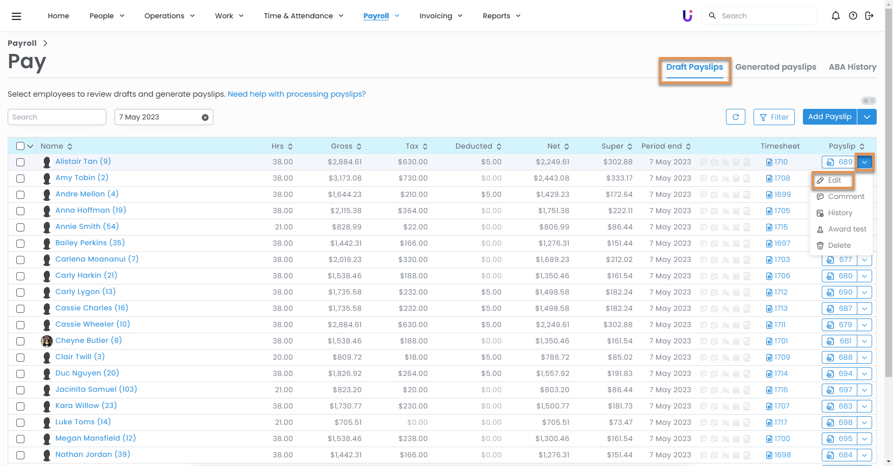 - Select the down arrow next to the payslip ID > Edit.