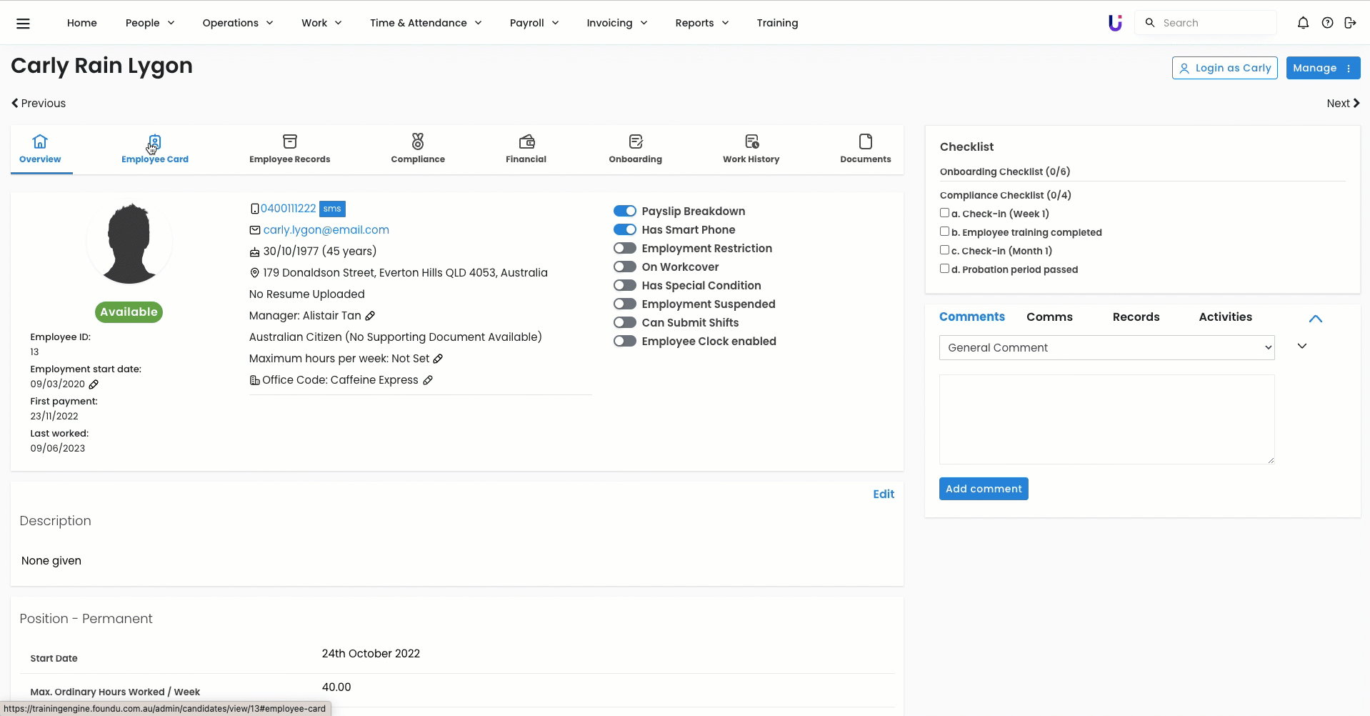 - Navigate to the relevant Employee Profile via People > Approved People or via the search bar.
