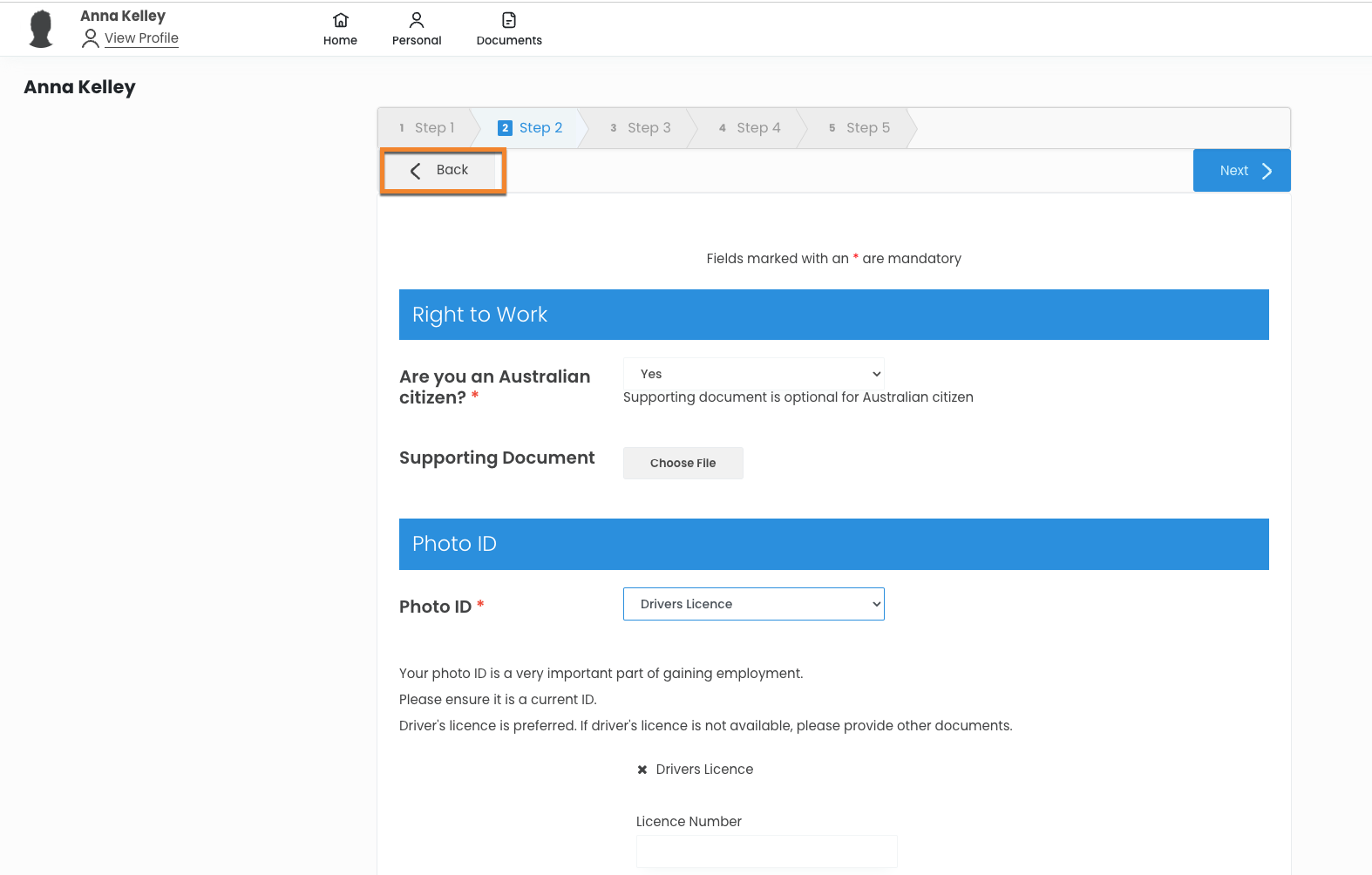 - Candidates will be able to navigate backwards to previous steps if they have missed inputting any information.