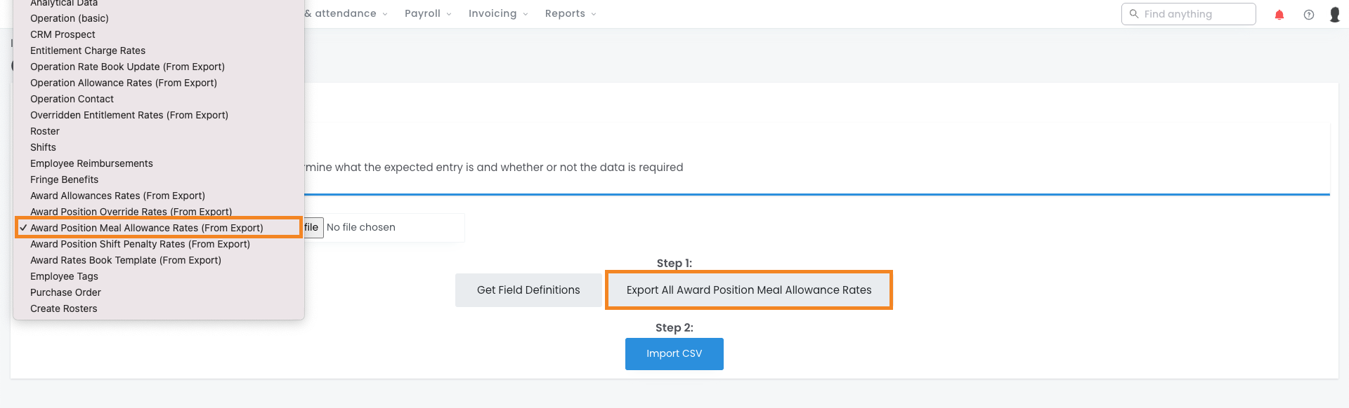 2. From the drop-down menu, select Award Position Meal Allowance Rates (From Export).