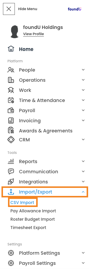 1. From your main menu, navigate to Import/ Export and select CSV Import.