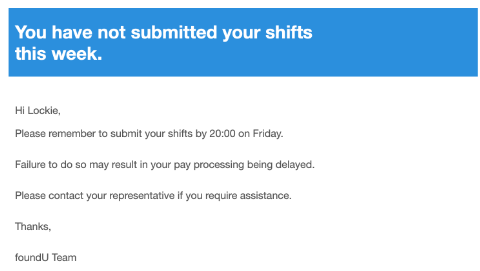 - I.e. The email and SMS will state, 'Submit your shifts by Friday at 8 pm'.