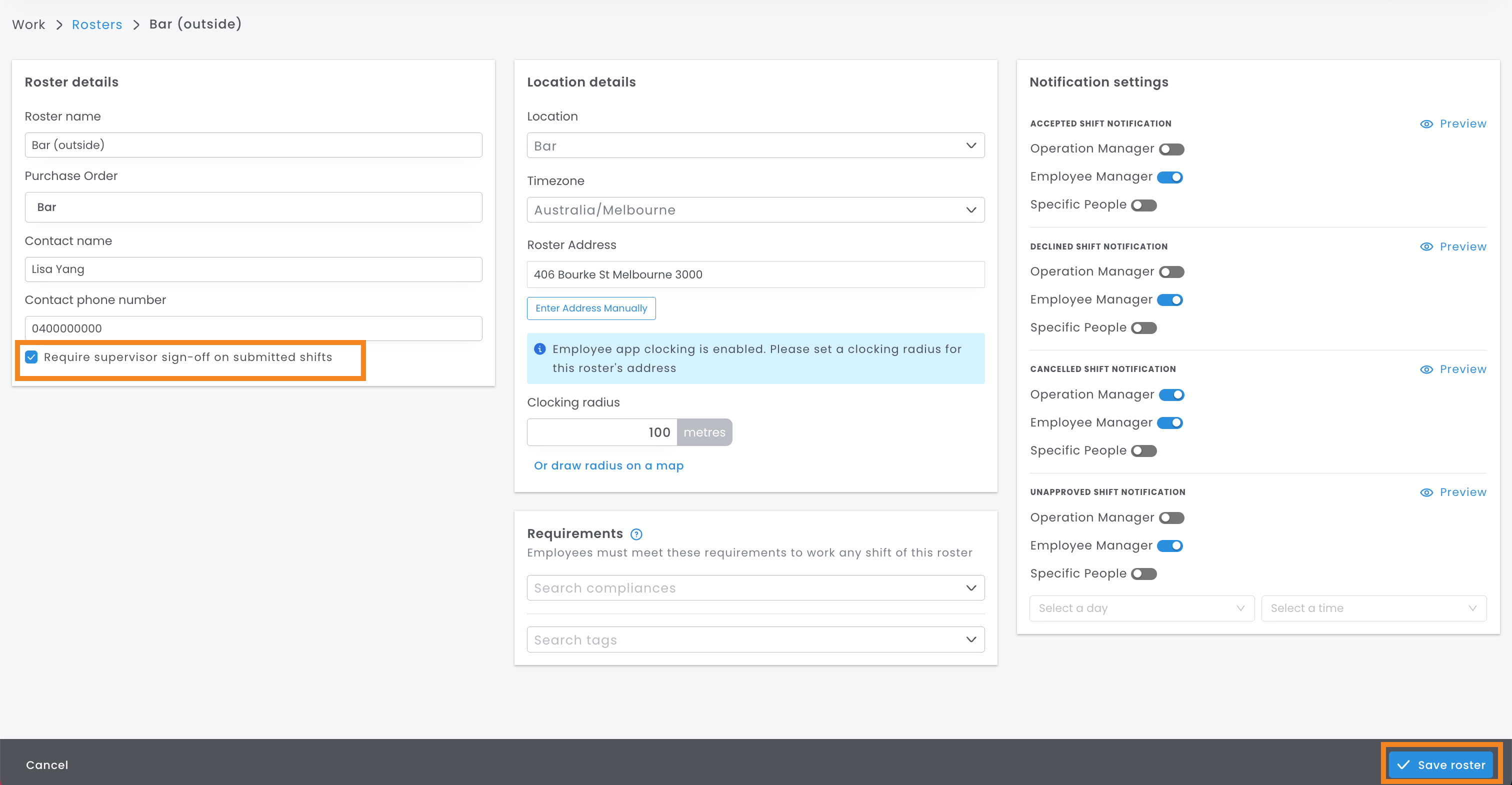 - The employee will only be able to edit a roster within the same Operation or location