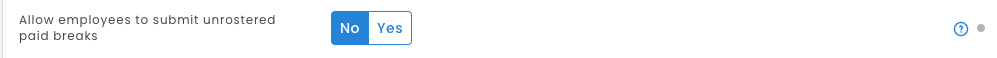 This setting is set to 'Yes' by default, which means your employees can select paid breaks for unrostered shifts. To update this setting, select 'No'.
