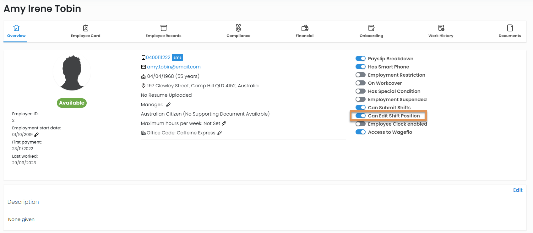 - Optionally enable the 'Can Edit Shift Position' toggle if the employee works multiple positions and needs to choose their relevant position when submitting shifts.
