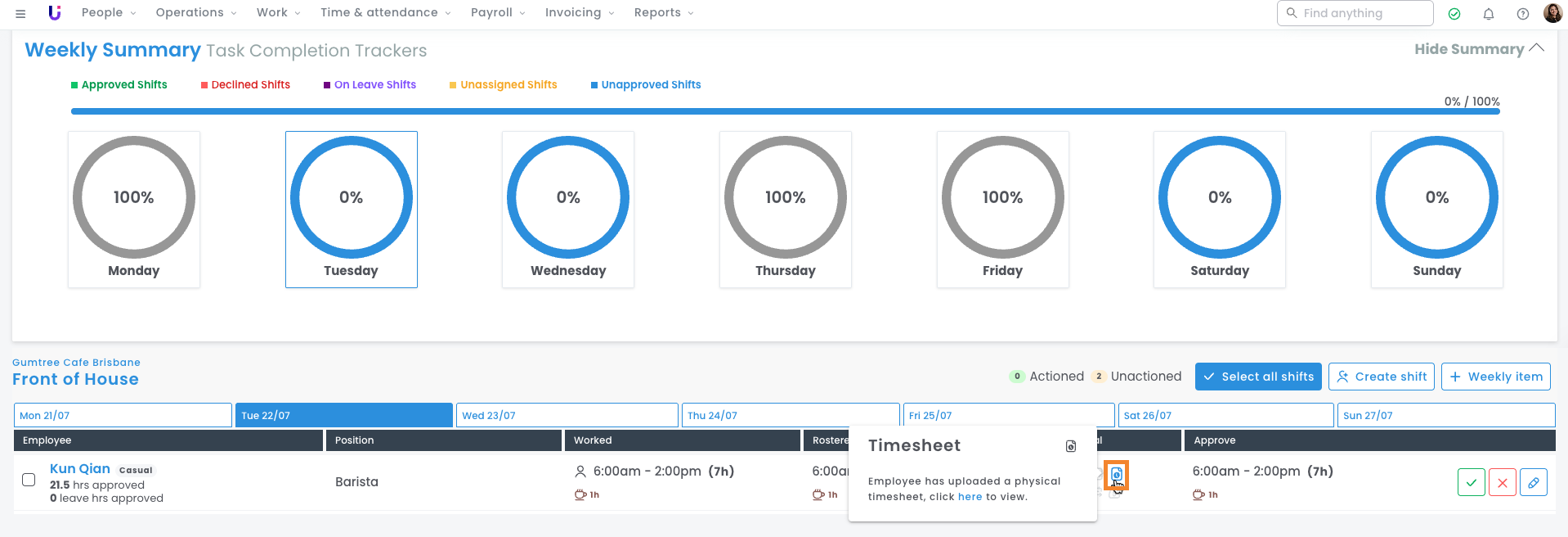 In this example, Kun has submitted his shift and uploaded a physical timesheet. The Timesheet icon in Approve Shifts will show any shifts with uploaded timesheets. You can optionally click to view the physical timesheet.