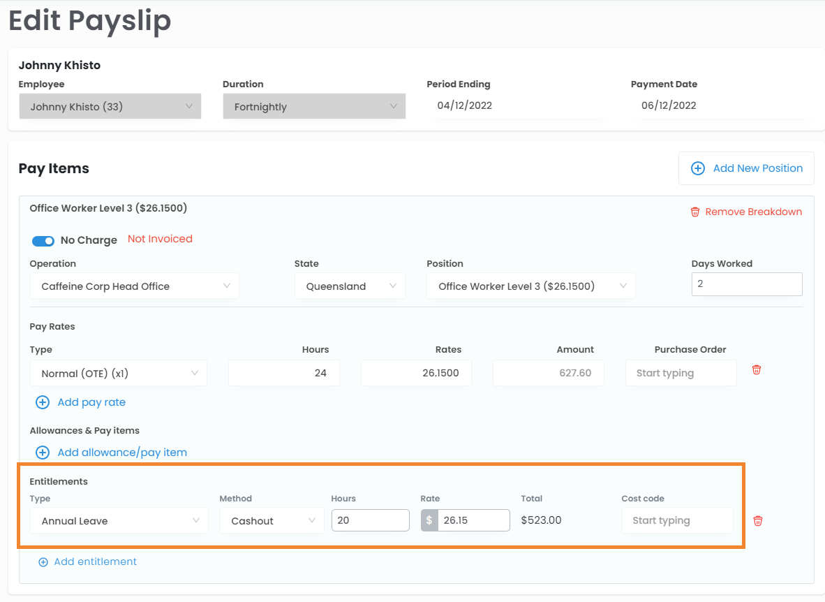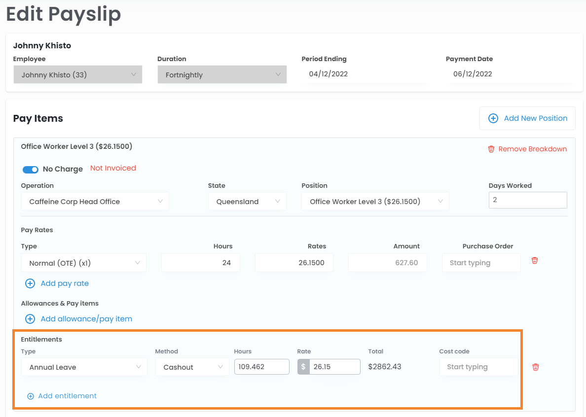 • Pay Out - The balance of the entitlement will be paid out on the final payslip for the permanent position. After that, the entitlement will be removed from the profile.
