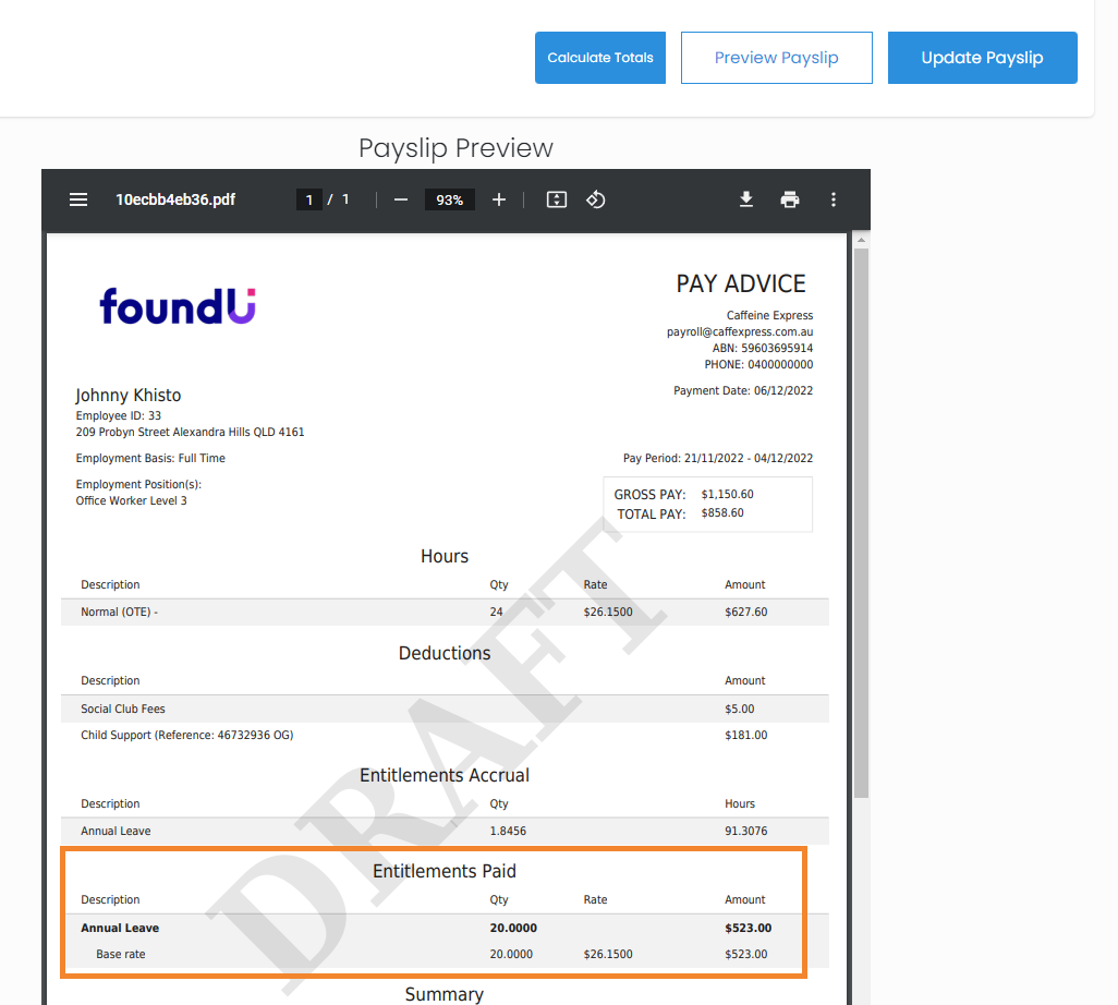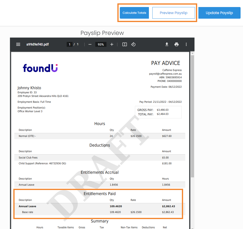 7. Then 'Preview Payslip'. Under the Entitlements Paid section, there will be a section with the leave type, e.g. Annual leave, along with the hours redeemed and the amount paid.