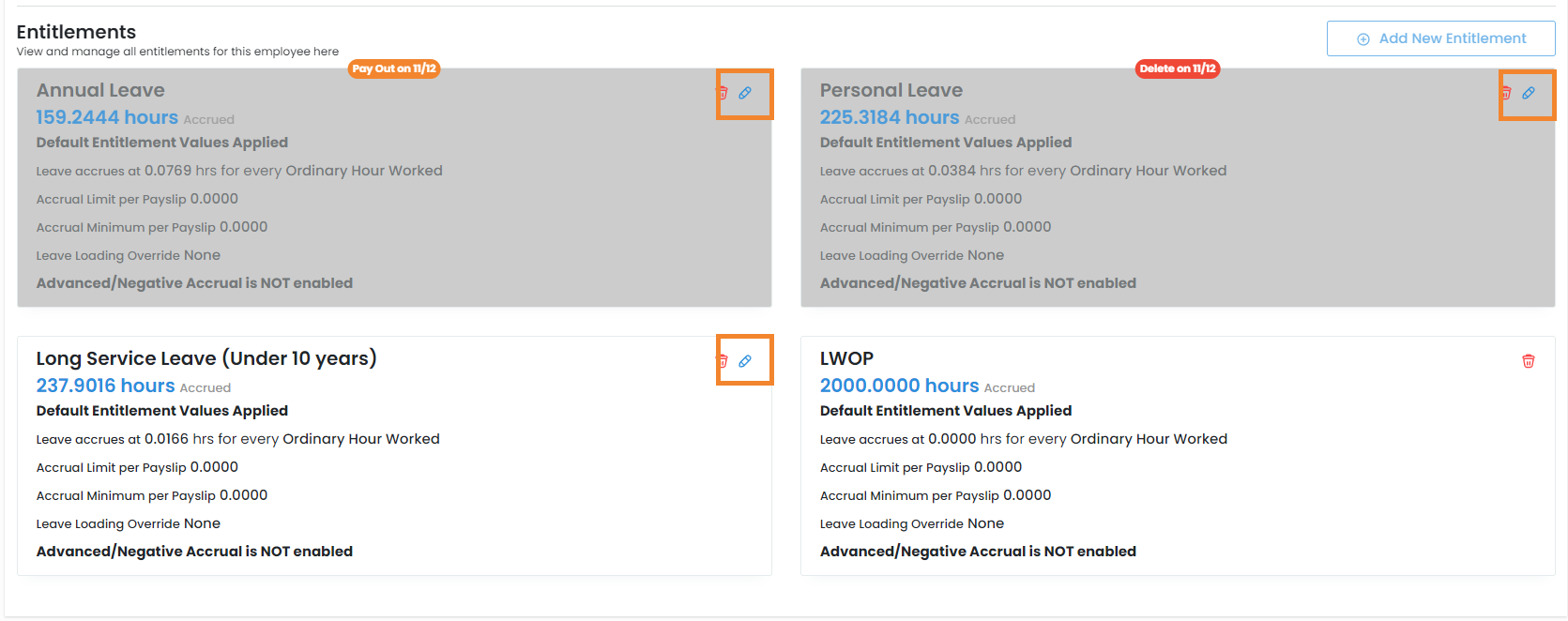 3. If a future date is set for the casual position, what happens to the entitlements can be changed by editing them individually. As seen below, you can also easily identify which option has been selected for each entitlement.
