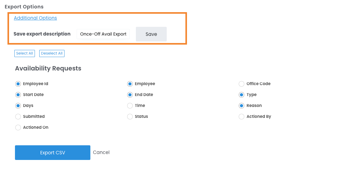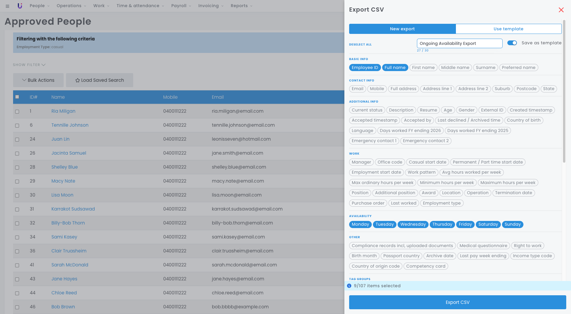 From the Export CSV drawer, select the information you wish to export. At a minimum, you'll want Employee ID, Full Name, and the entire Availability section.